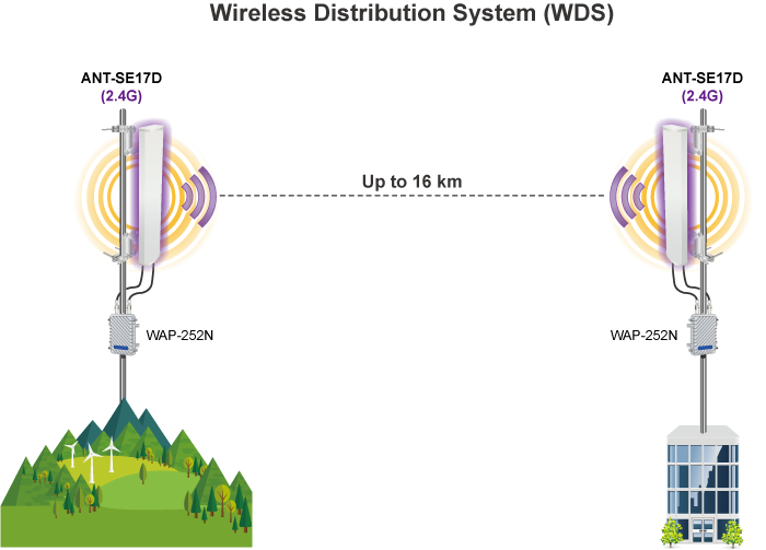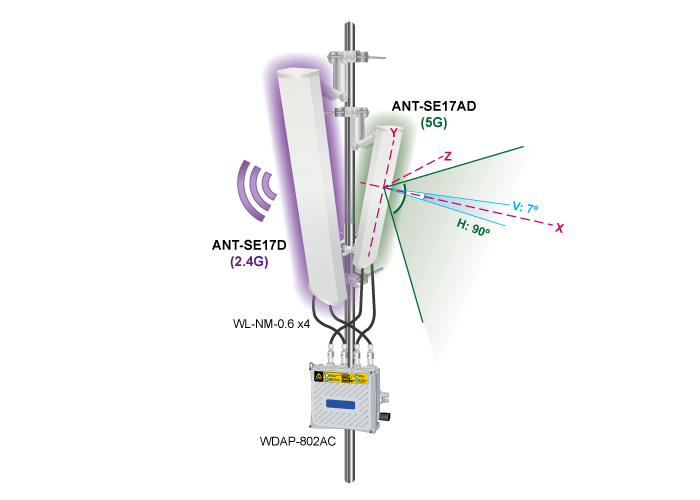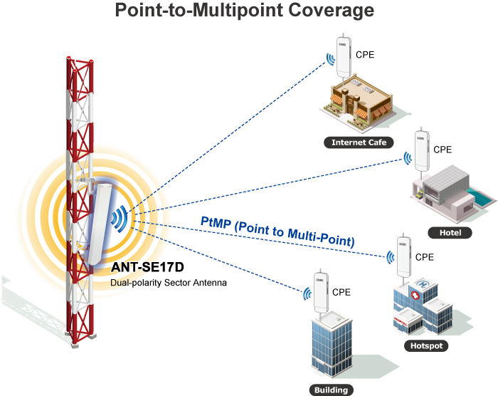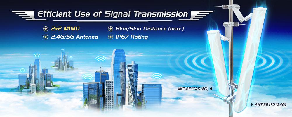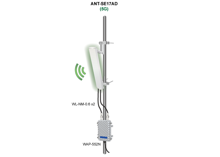 Como la ANT-SE17AD puede mejorar de manera efectiva el rendimiento y la cobertura del entorno 802.11ac de 5 GHz, también es bastante adecuada para aplicaciones LAN inalámbricas exteriores, como la conexión punto a punto entre almacenes.