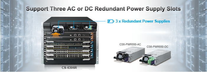 El CS-6306R está equipado con una unidad de fuente de alimentación extractiva de 100~240 V CA, por lo que es fácil reemplazar la energía para los usuarios. Además, el CS-6306R reserva otras dos ranuras de alimentación de respaldo en el panel frontal y los usuarios pueden agregar la segunda alimentación CA o CC a la instalación de fuente de alimentación redundante. La alimentación CA o CC es opcional. El sistema de alimentación redundante está diseñado específicamente para manejar las demandas de instalaciones de alta tecnología que requieren la mayor integridad de energía.