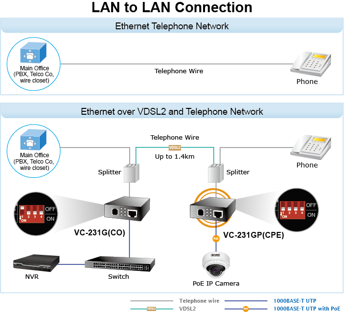 Los convertidores Gigabit Ethernet sobre VDSL2 de PLANET vienen con un diseño plug-and-play. El VC-231GP ofrece dos modos de funcionamiento, CPE y CO, para la aplicación: el modo CPE se utiliza en el lado del cliente y el modo CO en el lado central. El modo CPE o CO se puede ajustar mediante un interruptor DIP integrado.