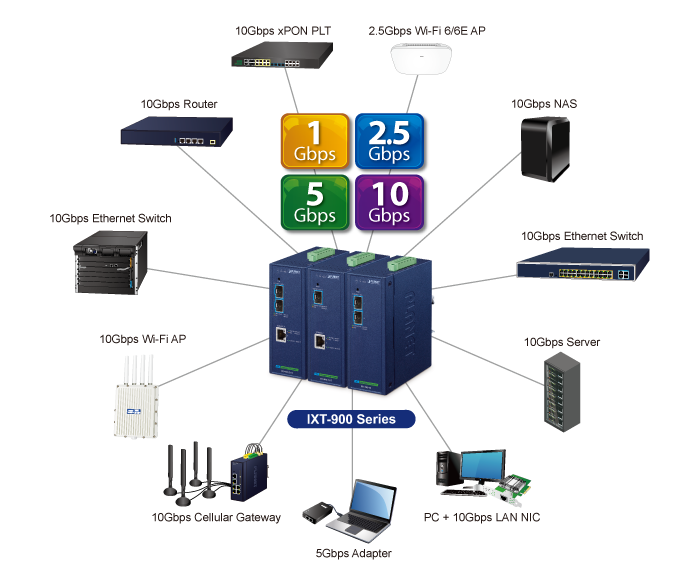 El IXT-900-2X1T puede alcanzar velocidades de hasta 10 Gbps a través de cableado de cobre o fibra óptica, lo que mejora enormemente el rendimiento de las transmisiones de datos de gran tamaño. Sus interfaces de cobre 10GBASE-T integradas cuentan con negociación automática de 5 velocidades (10G/5G/2,5G/1G/100) y pueden transmitir datos a 10 Gbps a través del cableado UTP Cat6/Cat6A existente, lo que elimina la necesidad de actualizaciones costosas. Con su diseño Plug and Play, la instalación es fácil y sin complicaciones, por lo que puede disfrutar de la velocidad que necesita sin ningún esfuerzo adicional.