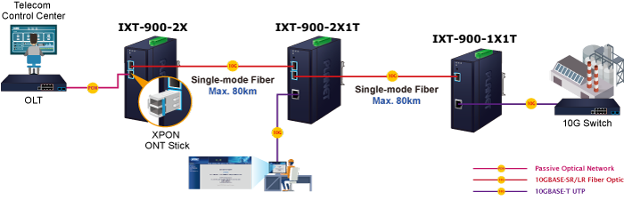 Los convertidores de medios convencionales generalmente admiten solo un par de conversiones de medios diferentes, como la conversión de una conexión de fibra a una de cobre. Pueden extender una conexión de cobre de 100 m a un máximo de 80 km de conexión de fibra óptica. En contraste, el IXT-900-2X1T tiene dos puertos de fibra óptica y un puerto de cobre, lo que permite que los dos cables de fibra óptica se conecten a dispositivos separados por hasta 160 km para extender significativamente la distancia de implementación.