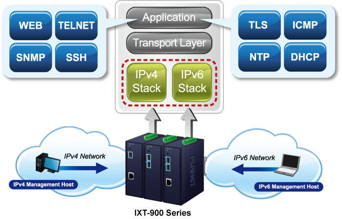 El IXT-900-2X1T, compatible con los protocolos IPv6 e IPv4, ayuda a las empresas y a las empresas de telecomunicaciones a dar el salto a la era IPv6 con la menor inversión posible, ya que no es necesario sustituir ni revisar las instalaciones de red si se configura la red de borde FTTx IPv6.