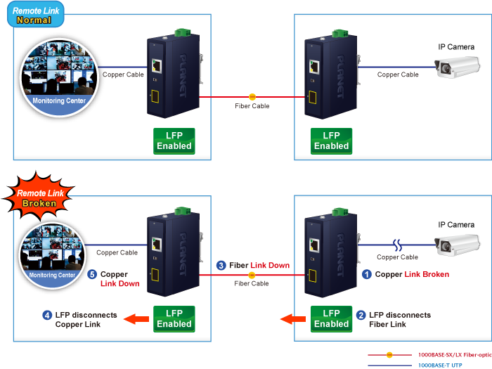 El IGT-815AT puede admitir la función LFP (Link Fault Passthrough) a través de su interruptor DIP integrado. La función LFP incluye Link Loss Carry Forward (LLCF) y Link Loss Return (LLR):