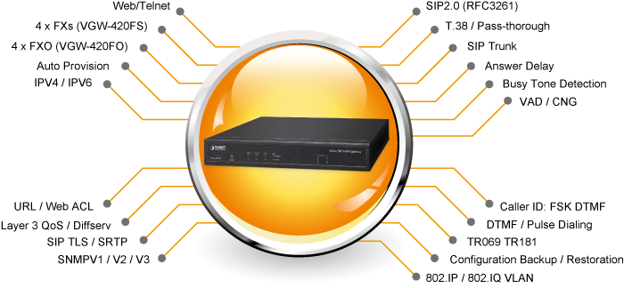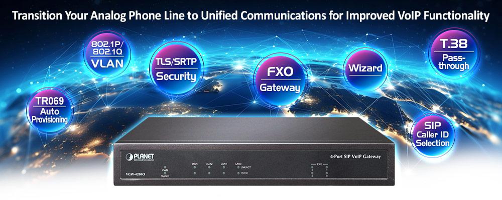 Para construir comunicaciones VoIP de alto rendimiento a bajo costo, PLANET ha lanzado el último modelo de puerta de enlace VoIP, la puerta de enlace VoIP SIP de 4 puertos de clase empresarial VGW-420FO. La puerta de enlace VGW-420FO proporciona una mayor flexibilidad durante la migración a las comunicaciones unificadas al admitir los dispositivos analógicos tradicionales. Por ejemplo, los trabajadores remotos pueden marcar a través de un sistema de comunicación VoIP unificado como una llamada de extensión, pero no se cobraría por llamada de larga distancia. También permite que las llamadas se transfieran a cualquier persona en cualquier lugar dentro del sistema de voz, lo que permite a la empresa comunicarse de manera más efectiva y es útil para agilizar los procesos comerciales.