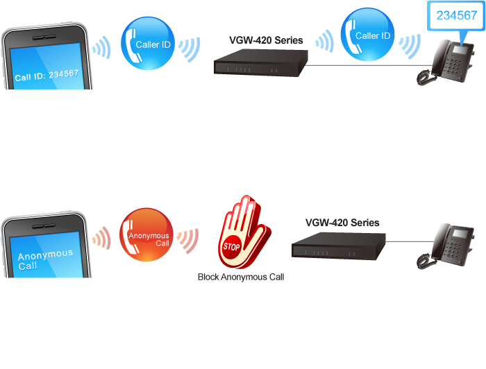Los puertos FXO y FXS de la serie VGW-420 (VGW-420FO/VGW-420FS) son compatibles con la función de identificación de llamadas, ayudan al usuario a identificar fácilmente el número de llamada y a verificar el número. También ayuda a bloquear llamadas anónimas filtrando llamadas extrañas. El puerto FXS transmite el identificador de llamadas, mientras que el puerto FXO recibe el identificador de llamadas. El identificador de llamadas interopera con teléfonos analógicos, redes telefónicas públicas conmutadas (PSTN) y centrales telefónicas privadas (PBX).