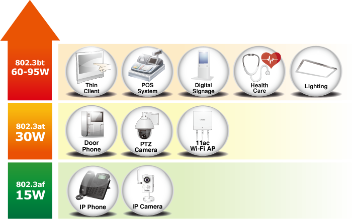Como el UPOE-400 adopta el estándar IEEE 802.bt PoE++ y la tecnología PoH, es capaz de generar hasta 90 vatios de potencia utilizando los cuatro pares de cableado Ethernet Cat5e/6 estándar para suministrar energía y datos a máxima velocidad a cada dispositivo remoto compatible con PoE. Posee el triple de capacidad de potencia, en comparación con el PoE+ 802.3at convencional. Es una solución ideal para satisfacer la creciente demanda de dispositivos remotos con mayor consumo de energía, como: