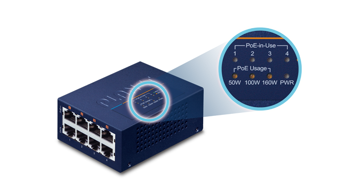 El UPOE-400 ayuda a los usuarios a monitorear el estado actual de la entrada de energía y el uso de energía PoE de manera fácil y eficiente a través de su indicador LED avanzado. El "LED de energía" permite al usuario conocer el estado de la entrada de energía de CC. El "Uso de PoE" que se muestra en el panel frontal del UPOE-400 tiene tres indicadores LED ámbar de diferentes usos de energía que indican 50 W, 100 W y 160 W. A través del LED de consumo de energía, el UPOE-400 permite al administrador monitorear el estado del consumo de energía de los dispositivos conectados en tiempo real.