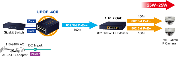 Con una capacidad de salida PoE de hasta 90 vatios, el UPOE-400 puede extenderse a una distancia mucho mayor utilizando el extensor PoE PLANET para alimentar el dispositivo PoE que se puede instalar a una distancia de más de 100 metros.