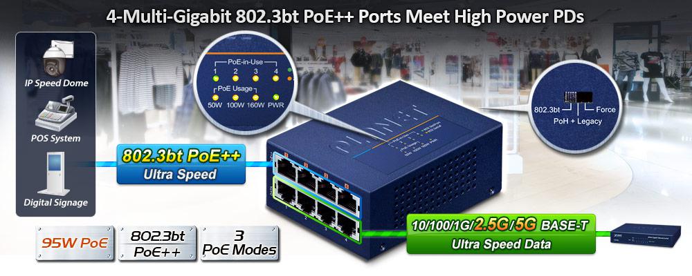El concentrador inyector PoE++ 802.3bt multigigabit de 4 puertos PLANET UPOE-400 cuenta con cuatro puertos inyectores PoE++ 802.3bt tipo 4 de 90 vatios 10/100/1G/2.5G/5GBASE-T. Con un presupuesto PoE total de 160 vatios, proporciona alimentación PoE++ 802.3bt a través de cables UTP Ethernet que permiten que los datos y la alimentación se transmitan simultáneamente a un dispositivo (PD) remoto alimentado por 802.3bt/at.
