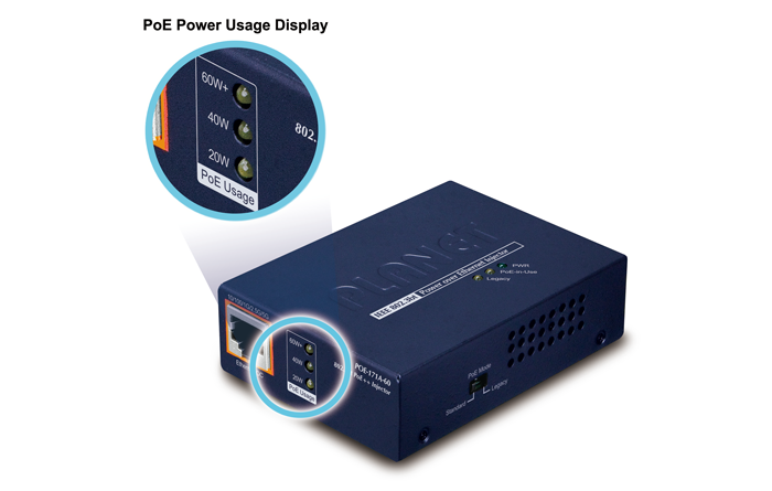 Además, el POE-171A-60 ayuda a los usuarios a monitorear el estado actual del uso de energía PoE de manera fácil y eficiente a través de su indicador LED avanzado. El indicador “PoE Power Usage” que se muestra en el panel frontal del POE-171A-60 tiene tres indicadores LED de diferentes usos de energía. A través del LED de uso de energía, el POE-171A-60 permite al administrador monitorear el estado del uso de energía de los dispositivos de almacenamiento conectados en tiempo real.