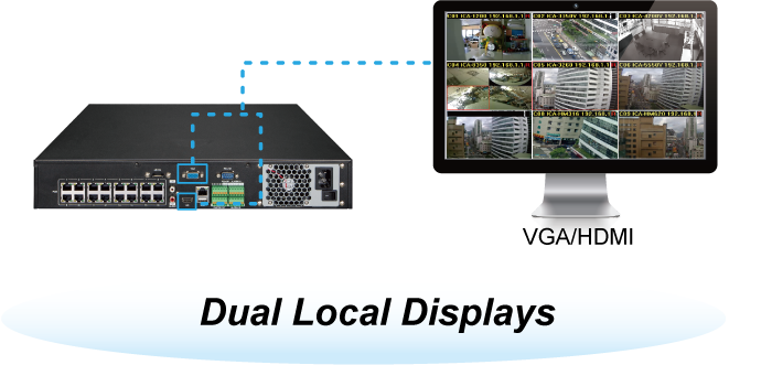 El NVR-2516P viene con interfaces de salida de video HDMI y VGA para pantalla local dual. Se puede conectar a un monitor HDMI 4K y a un monitor VGA 1080P por separado, donde los contenidos de visualización en directo o los contenidos de reproducción se pueden mostrar simultáneamente. Con la función de pantalla local dual, los usuarios pueden monitorear localmente con alta flexibilidad en una resolución de pantalla diferente, eliminando así la necesidad de una PC separada para ver video desde la unidad. Además, el NVR también se puede operar con el mouse USB para configurar y monitorear todos los sistemas fácilmente.