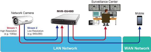 El NVR ofrece gestión de doble flujo en las funciones de grabación y visualización en directo. El usuario puede supervisar o grabar el flujo 1 o el flujo 2 de dispositivos de doble flujo. Este diseño puede reducir la carga de CPU y memoria del NVR que gestiona una gran cantidad de canales.