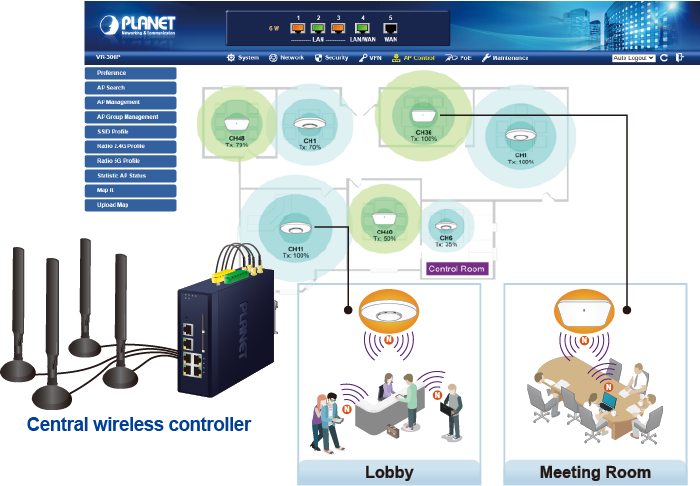 El ICG-2515-NR proporciona una administración centralizada de la serie PLANET Smart AP a través de una interfaz gráfica de usuario web fácil de usar. Es fácil configurar el AP para la SSID inalámbrica, la banda de radio y las configuraciones de seguridad. Con un proceso de configuración de cuatro pasos, los perfiles inalámbricos para diferentes propósitos se pueden entregar simultáneamente a múltiples AP o grupos de AP para minimizar el tiempo, el esfuerzo y el costo de implementación.