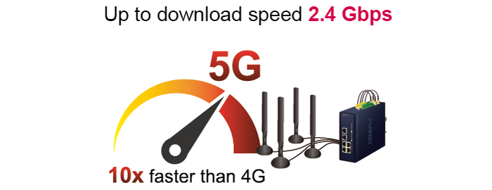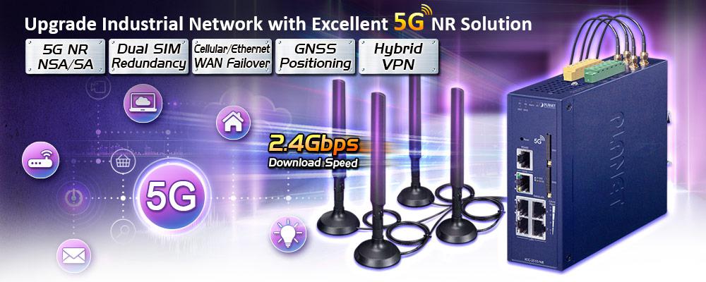 PLANET ICG-2515-NR es un gateway celular de grado industrial para aplicaciones móviles exigentes, M2M (máquina a máquina) e implementaciones de IoT. Actualizado a la última tecnología celular de 5G NR (nueva radio), el ICG-2515-NR puede proporcionar acceso de banda ancha ultrarrápido con la red celular 5G. El ICG-2515-NR también cuenta con cinco puertos Ethernet (4 LAN y 1 WAN), puerto serial (RS485), interfaces DI y DO y tecnología VPN, todo en una carcasa de metal compacta pero resistente. Establece una conexión celular rápida entre dispositivos equipados con puerto serial y Ethernet. El ICG-2515-NR es particularmente ideal para la automatización industrial, la fábrica digital y otras aplicaciones industriales.