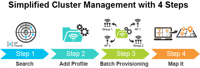 Por ejemplo, para configurar varios puntos de acceso inteligentes del mismo modelo, el IVR-300FP permite agruparlos en un grupo gestionado para una gestión unificada. Según los requisitos, los puntos de acceso inalámbricos se pueden ampliar o eliminar de un grupo de puntos de acceso inalámbricos en cualquier momento. El clúster de puntos de acceso se beneficia de la provisión masiva y la actualización masiva del firmware a través de un único punto de entrada en lugar de tener que configurar los ajustes en cada uno de ellos por separado.