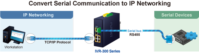 El IVR-300FP proporciona una función que puede convertir la comunicación serial RS485 a redes IP. La señal Ethernet permite que dos tipos de segmentos se conecten de manera fácil, eficiente y económica. La solución ayuda a los usuarios y a los SI a ahorrar gastos, ya que no es necesario reemplazar el equipo serial y el sistema de software existentes.