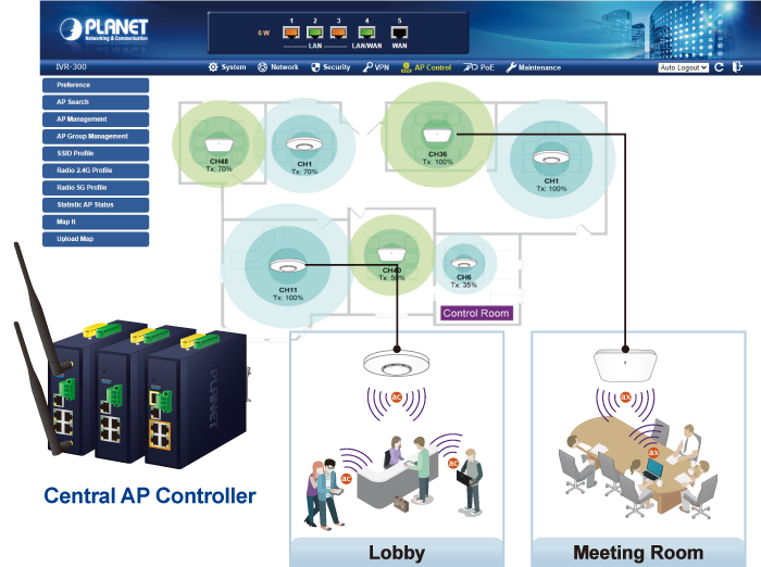 El IVR-300FP proporciona una gestión centralizada de la serie PLANET Smart AP a través de una interfaz gráfica de usuario web fácil de usar. Es fácil configurar el punto de acceso para la SSID inalámbrica, la banda de radio y los ajustes de seguridad. Con un proceso de configuración de cuatro pasos, los perfiles inalámbricos para diferentes propósitos se pueden enviar simultáneamente a varios puntos de acceso o grupos de puntos de acceso para minimizar el tiempo, el esfuerzo y el coste de la implementación.