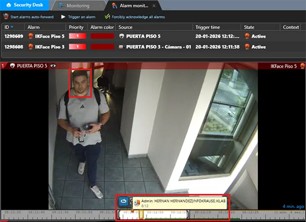 Integración mediante marcadores (bookmarks): IKFace crea un marcador en la línea de tiempo del VMS en el momento exacto del reconocimiento facial. Envío de eventos al panel de alarmas de Genetec.
