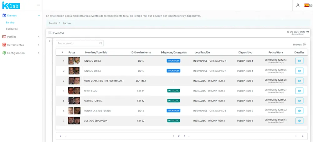 En esta sección podrá monitorear los eventos de reconocimiento facial en tiempo real que ocurren por localizaciones y dispositivos.
