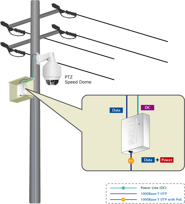 El POE-161S puede dividir la potencia de 52~56 V CC a través del cable Ethernet en una salida de potencia de 5 V o 12 V CC seleccionable. Está diseñado específicamente para satisfacer la demanda de equipos de red que requieren mayor potencia, como cámaras de red PTZ (pan, tilt y zoom), cámaras domo de velocidad PTZ, teléfonos de pantalla táctil a color/video y voz sobre IP (VoIP), puntos de acceso LAN inalámbricos multicanal (11a/ac/b/g/n) y otros dispositivos de red que necesitan mayor potencia para funcionar normalmente pero que no pueden satisfacerse con el estándar IEEE 802.3af PoE. El divisor de alimentación por Ethernet Gigabit IEEE 802.3at POE-161S es una solución ideal que permite que los dispositivos de red con alto consumo de energía se alimenten directamente a través de la interfaz RJ45 sin la necesidad de tomas de corriente ni cableado eléctrico.