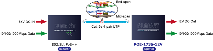 El POE-173S-12V, al trabajar con conmutadores o inyectores PLANET 802.3bt tipo 4 PoE++, ofrece más aplicaciones de red a los dispositivos cliente, como:
