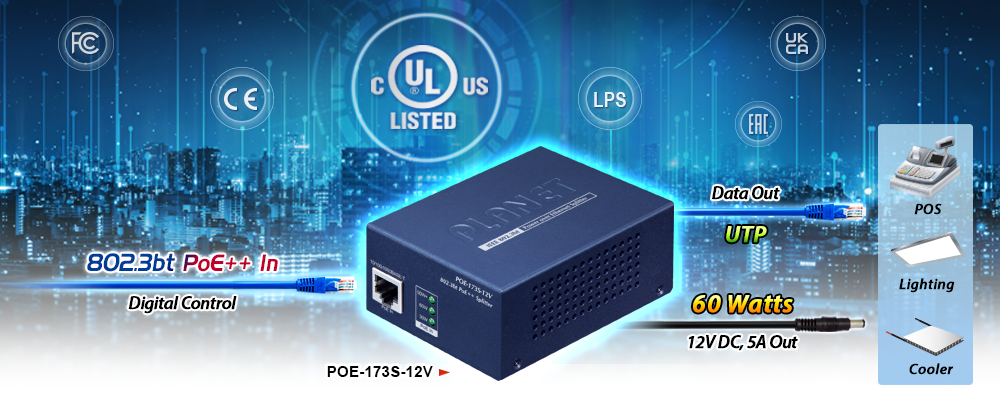 El divisor de alimentación a través de Ethernet Gigabit 802.3bt PLANET POE-173S-12V, que entrega datos digitales Ethernet y alimentación PoE desde un PSE (equipo de fuente de alimentación) PoE++ tipo 4 802.3bt a través de un cable UTP, viene con una salida de CC de 12 V, lo que permite entregar una salida de potencia máxima de 60 vatios a un dispositivo Ethernet sin alimentación PoE. Admite conexión Ethernet pasiva de 10/100/1000 Mbps y una distancia de hasta 100 metros.