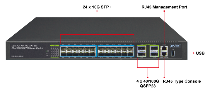 PLANET XGS-6350-24X4C es un conmutador gestionable de capa 3 de alto rendimiento que cumple con los requisitos de red de próxima generación de centros de datos, campus y empresas. Tiene 24 interfaces de fibra 10G SFP+ y 4 interfaces de fibra 40G/100GbE QSFP28 de alta densidad entregadas en un estuche resistente de 1RU.