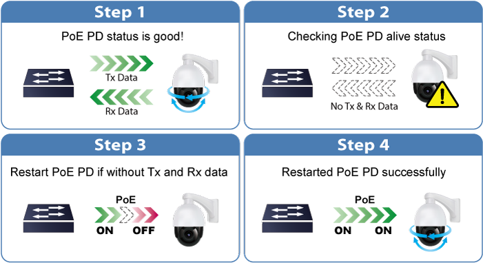 El MGS-6311-8P2X puede monitorear el estado del dispositivo alimentado conectado en tiempo real a través de la función de comprobación de actividad del dispositivo alimentado. Una vez que el dispositivo alimentado deja de funcionar y responder, el MGS-6311-8P2X reanudará la alimentación PoE y hará que el dispositivo alimentado vuelva a funcionar. Mejorará en gran medida la confiabilidad de la red a través del puerto PoE que restablece la fuente de alimentación del dispositivo alimentado y reduce la carga de administración del administrador.