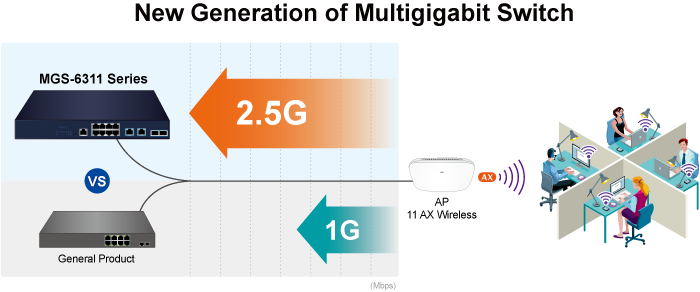 Con velocidades de acceso de terminal de los puntos de acceso inalámbricos 802.11ac/ax que alcanzan entre 1,2 Gbps y 3,6 Gbps, los puertos Gigabit no han podido satisfacer la demanda. El MGS-6311-8P2X, que admite una capacidad de 2,5 Gbps y una salida PoE 802.3af/at, no solo puede enviar datos a puntos de acceso inalámbricos 802.11ac/ax, sino también suministrar energía con los cables Ethernet CAT5e existentes a otros dispositivos alimentados, como puntos de acceso y cámaras IP. Definitivamente puede brindarle la velocidad que necesita y su Plug and Play hace que la instalación sea sencilla.