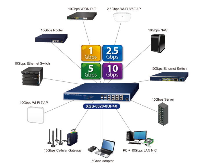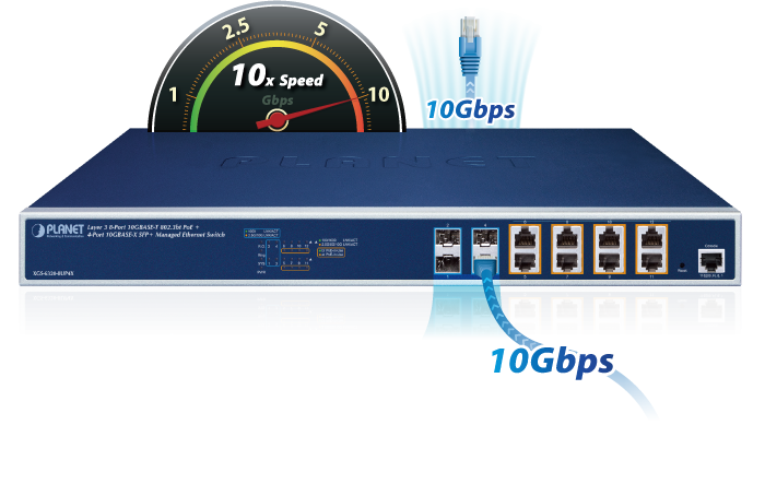 El XGS-6320-8UP4X de PLANET tiene la capacidad de alcanzar una alta velocidad de 10 Gbps a través de cableado de cobre o fibra óptica, lo que ayuda a acelerar el rendimiento de la transmisión de datos de gran tamaño. Las interfaces de cobre 10GBASE-T integradas admiten negociación automática de 5 velocidades (10G/5G/2.5G/1G/100) y transmisión de datos de 10 Gbps con el cableado UTP Cat6/Cat6A existente, lo que significa que la velocidad se puede aumentar sin costos. Definitivamente puede brindarle la velocidad que exige y su Plug and Play hace que la instalación sea fácil.