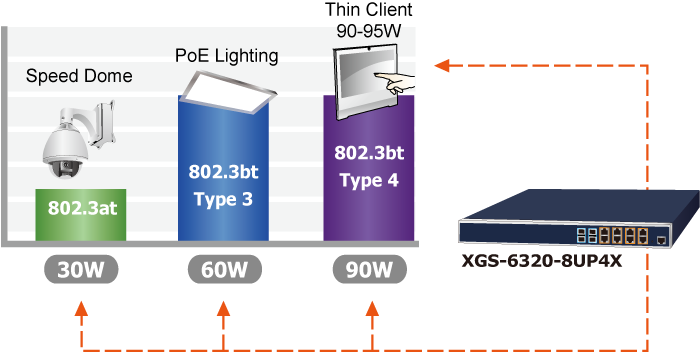 El XGS-6320-8UP4X cumple con los estándares de la tecnología IEEE 802.bt PoE++ y tiene una capacidad de potencia total de 420 vatios. Puede suministrar hasta 95 vatios de potencia a cada dispositivo alimentado (PD) compatible con PoE utilizando los cuatro pares de cableado Ethernet Cat5e/6 estándar, lo que garantiza una entrega de datos de alta potencia y máxima velocidad. En comparación con el PoE+ 802.3at convencional, ofrece una capacidad de potencia triple, lo que lo convierte en la solución perfecta para dispositivos de mayor consumo de energía, incluidos: