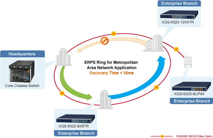 La serie XGS-6320 admite la tecnología de anillo redundante y cuenta con una capacidad de autorrecuperación rápida y sólida para evitar interrupciones e intrusiones externas. Incorpora la tecnología avanzada ITU-T G.8032 ERPS (Ethernet Ring Protection Switching) y el protocolo Spanning Tree (802.1w RSTP) en la red del cliente para mejorar la confiabilidad del sistema y el tiempo de funcionamiento en entornos hostiles. En una determinada red Ring simple, el tiempo de recuperación podría ser inferior a 10 ms para que la red vuelva rápidamente a su funcionamiento normal.