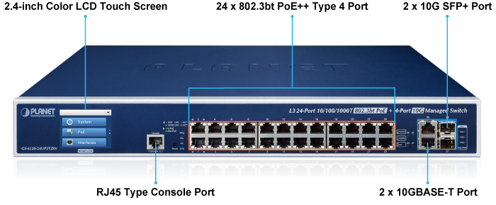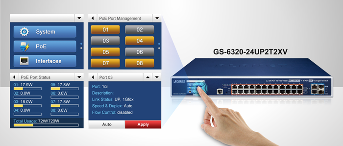 PLANET GS-6320-24UP2T2XV es un switch gestionable PoE 802.3bt Gigabit de 1,25 U y con una relación calidad-precio optimizada, con pantalla táctil LCD que incluye funciones PoE inteligentes PLANET para mejorar la disponibilidad de aplicaciones empresariales críticas. Ofrece gestión de doble pila IPv6/IPv4 y un motor de conmutación Gigabit L2+/L4 integrado junto con 24 puertos 10/100/1000BASE-T 802.3bt PoE++, 2 puertos 10GBASE-T RJ45 y 2 puertos 10Gigabit SFP+ adicionales. Con un presupuesto de energía total de hasta 720 vatios para diferentes tipos de aplicaciones PoE, el GS-6320-24UP2T2XV proporciona una solución de red PoE 802.3bt rápida, segura y rentable para pequeñas empresas y grandes empresas.