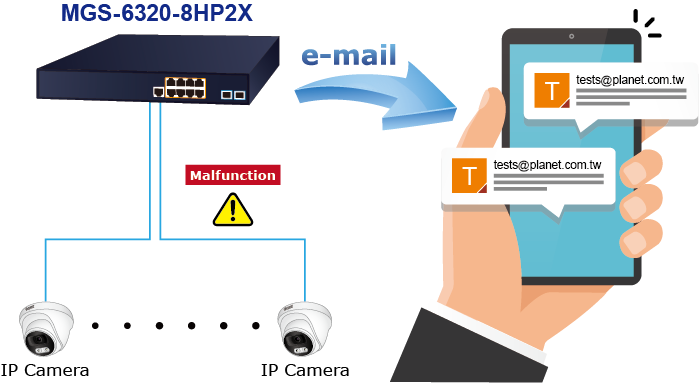 Aunque la mayoría de los software de gestión de cámaras o NVR ofrecen una función de alerta por correo electrónico SMTP, el MGS-6320-8HP2X también ofrece una función de alerta de eventos para ayudar a diagnosticar el dispositivo anormal debido a si hay o no una interrupción de la conexión de red, pérdida de alimentación PoE o la respuesta de reinicio por el proceso PD Alive Check.