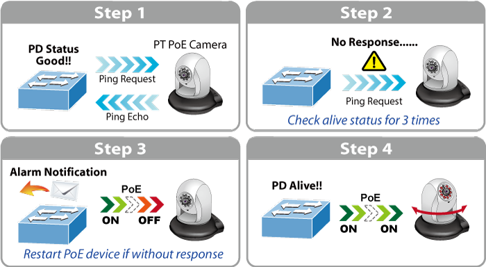 El MGS-6320-8HP2X se puede configurar para supervisar el estado de un PD conectado en tiempo real a través de una acción de ping. Una vez que el PD deja de funcionar y no responde, el MGS-6320-8HP2X reanudará la alimentación del puerto PoE y hará que el PD vuelva a funcionar. Mejorará en gran medida la fiabilidad de la red a través del puerto PoE que restablece la fuente de alimentación del PD, lo que reduce la carga de gestión del administrador.