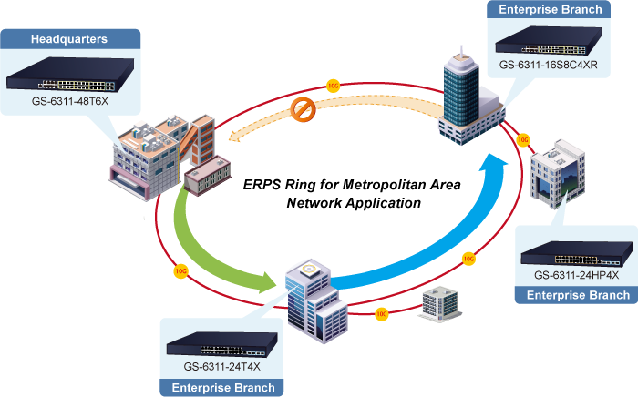 El GS-6311-48T6X admite la tecnología de anillo redundante y presenta una capacidad de autorrecuperación rápida y sólida para evitar interrupciones e intrusiones externas. Incorpora tecnología avanzada ITU-T G.8032 ERPS (Ethernet Ring Protection Switching) y protocolo Spanning Tree (802.1s MSTP) en la red del cliente para mejorar la confiabilidad del sistema y el tiempo de funcionamiento en entornos hostiles. En una determinada red de anillo simple, el tiempo de recuperación podría ser inferior a 15 ms para que la red vuelva rápidamente a funcionar con normalidad.