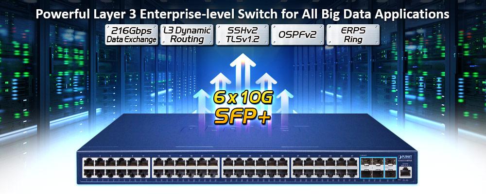 El GS-6311-48T6X ofrece rendimiento de alta densidad, enrutamiento estático de capa 3, RIP (protocolo de información de enrutamiento) y OSPF (primero la ruta más corta abierta). Con interfaces de 10 Gbps y una red de conmutación de 216 Gbps, el GS-6311-48T6X puede manejar cantidades extremadamente grandes de datos en una topología segura que se vincula a una red troncal empresarial o a servidores de alta capacidad. Las potentes funciones de seguridad de red hacen que el GS-6311-48T6X realice un control eficaz del tráfico de datos para ISP y aplicaciones empresariales de VoIP, transmisión de video y multidifusión.