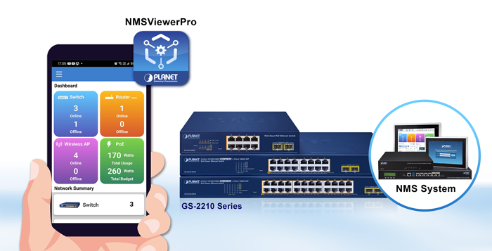 La serie de conmutadores inteligentes web GS-2210, conocida por funciones como QoS, agregación de enlaces, VLAN, IGMP, etc., ofrece una característica llamativa llamada NMS desarrollada por PLANET para gestionar y supervisar de forma sencilla y remota los dispositivos de red en el entorno local desde una aplicación móvil. Esta característica no solo mejora la comodidad operativa, sino que también garantiza que los usuarios tengan control en tiempo real sobre su infraestructura de red. Proporciona a los usuarios una experiencia sin igual.
