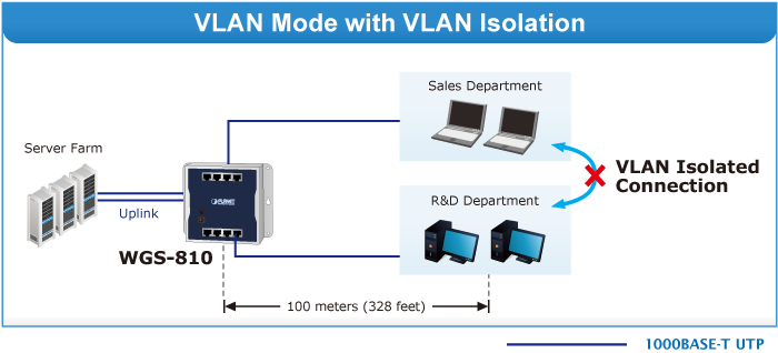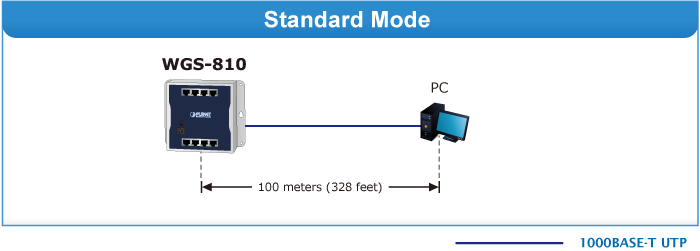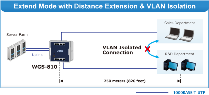 En el modo de funcionamiento extendido, el WGS-810 funciona por puerto a una velocidad de funcionamiento dúplex de 10 Mbps, pero a una distancia de hasta 250 metros, superando el límite de 100 m del cable UTP Ethernet. También admite el aislamiento de VLAN para aislar los puertos y así evitar tormentas de difusión y protegerse de la suplantación de DHCP en el modo de funcionamiento extendido.