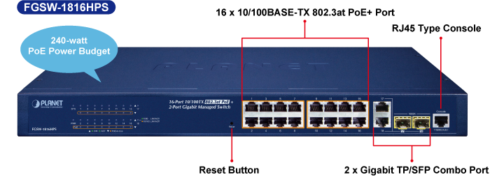El conmutador administrado PoE+ de capa 2 FGSW-1816HPS de PLANET, recientemente revisado, está diseñado para empresas e industrias donde se puede administrar de forma central una red de PD. Las funciones de administración del conmutador se han mejorado para incluir administración inteligente de PoE, administración de IPv6, ACL, GVRP y más.