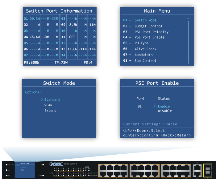 PLANET FGSW-2622VHP ofrece un panel de color intuitivo en su panel frontal que facilita la gestión de Ethernet y la gestión de PD PoE. Promueven en gran medida la eficiencia de la gestión en redes a gran escala para empresas, hoteles, centros comerciales, edificios gubernamentales y otras áreas públicas, y cuentan con las siguientes funciones especiales de gestión y estado: