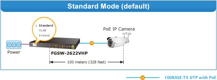 PLANET FGSW-2622VHP ofrece modos de funcionamiento Estándar, VLAN y Extendido. El FGSW-2622VHP funciona como un conmutador PoE IEEE 802.3af/at normal en el modo de funcionamiento Estándar. El modo de funcionamiento VLAN presenta la función VLAN basada en puerto que puede ayudar a evitar que la tormenta de multidifusión o difusión de la cámara IP se influya entre sí.