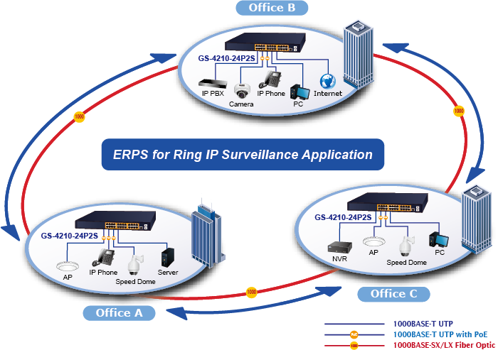 El GS-4210-24P2S admite la tecnología de anillo redundante y cuenta con una capacidad de autorrecuperación rápida y sólida para evitar interrupciones e intrusiones externas. Incorpora tecnología avanzada ITU-T G.8032 ERPS (Ethernet Ring Protection Switching), protocolo Spanning Tree (802.1s MSTP) en la red del cliente para mejorar la confiabilidad y el tiempo de actividad del sistema en varios entornos.
