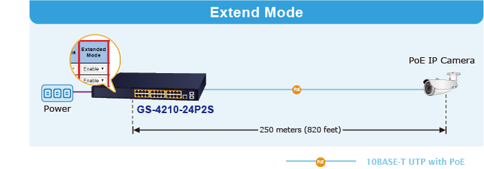 En el modo de funcionamiento "Extendido", el GS-4210-24P2S funciona por puerto a una velocidad dúplex de 10 Mbps, pero puede admitir una salida de alimentación PoE de 20 vatios a una distancia de hasta 250 metros, superando el límite de 100 m del cable UTP Ethernet. Con esta nueva función, el GS-4210-24P2S proporciona una solución adicional para la extensión de la distancia PoE 802.3at/af, lo que permite ahorrar el coste de instalación del cable Ethernet.