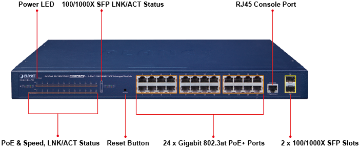 PLANET GS-4210-24P2S es un switch PoE Gigabit ideal que ofrece una ventaja rentable para la red de área local y es ampliamente aceptado en la red de oficinas de PYMES. Ofrece funciones inteligentes de conmutación y administración de paquetes de datos de Capa 2, una interfaz de usuario web amigable y un funcionamiento estable. El modelo cumple con IEEE 802.3at Power over Ethernet Plus (PoE+) a un precio asequible. El GS-4210-24P2S está equipado con 24 puertos Gigabit Ethernet 10/100/1000BASE-T y 2 interfaces SFP 100/1000BASE-X con sistema de alimentación interno. Sus 24 puertos Gigabit Ethernet están integrados con la función de inyector PoE+ 802.3at en todos los puertos. Ofrece una solución de alimentación segura, confiable, asequible y que se puede montar en bastidor para PYMES que implementan redes Power over Ethernet o que requieren una mejor seguridad de datos y administración del tráfico de red.