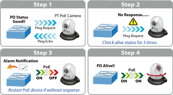 El GS-4210-24P2S se puede configurar para supervisar el estado del PD (dispositivo alimentado) conectado en tiempo real mediante una acción de ping. Una vez que el PD deja de funcionar y responder, el GS-4210-24P2S reanudará la alimentación del puerto PoE y hará que el PD vuelva a funcionar. Mejorará en gran medida la fiabilidad de la red a través del puerto PoE que restablece la fuente de alimentación del PD y reduce la carga de gestión del administrador.