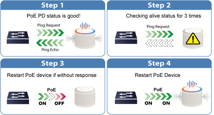 En las configuraciones Pro AV modernas, el uso de PoE para dispositivos como micrófonos, parlantes y pantallas ofrece facilidad de instalación y mayor flexibilidad. La gestión inteligente de PoE de Planet, que incluye PD Alive Check, puede detectar y reiniciar automáticamente los dispositivos que no responden, lo que simplifica el mantenimiento y mejora la eficiencia y la conveniencia.