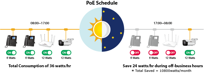 En el marco de la tendencia mundial de ahorro de energía y de contribución a la protección del medio ambiente, el GS-4210-16UP4C puede controlar eficazmente la fuente de alimentación, además de su capacidad de proporcionar una gran potencia en vatios. La función de "programación PoE" le ayuda a habilitar o deshabilitar la alimentación de energía PoE para cada puerto PoE durante intervalos de tiempo específicos y es una función potente para ayudar a las PYMES o empresas a ahorrar energía y dinero. También aumenta la seguridad al apagar los dispositivos de almacenamiento que no deberían estar en uso fuera del horario comercial.