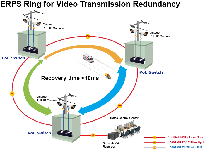 El GS-4210-16UP4C admite la tecnología de anillo redundante y cuenta con una capacidad de autorrecuperación rápida y sólida para evitar interrupciones e intrusiones externas. Incorpora tecnología avanzada ITU-T G.8032 ERPS (Ethernet Ring Protection Switching), protocolo Spanning Tree (802.1s MSTP) en la red del cliente para mejorar la confiabilidad del sistema y el tiempo de actividad en varios entornos.
