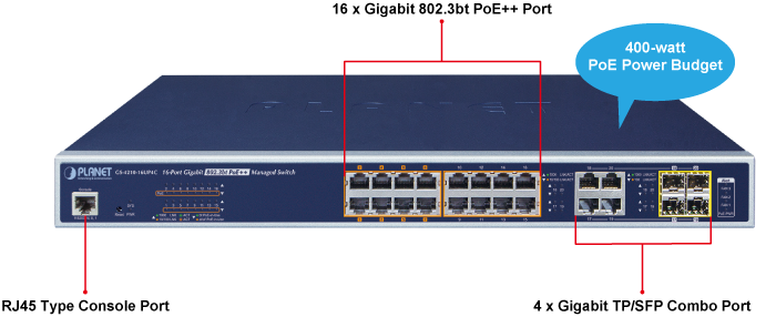 16 puertos 10/100/1000T 802.3bt PoE++ más 4 puertos Gigabit TP/SFP Combo Managed Switch